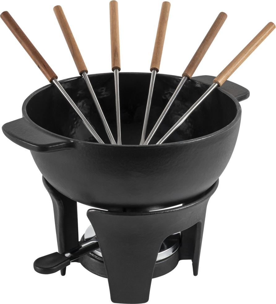 Das Gusseisen hält die Temperatur konstant – ideal für genussvolle Abende in guter Gesellschaft. Der integrierte Gabeleinsatz sorgt für Ordnung im Topf. Je nachdem, wonach der Abend verlangt, eignet sich das Set mit seinen 2 Litern Volumen für Fleischfondue mit 4-6 Personen oder Käsefondue mit bis zu 4 Personen.