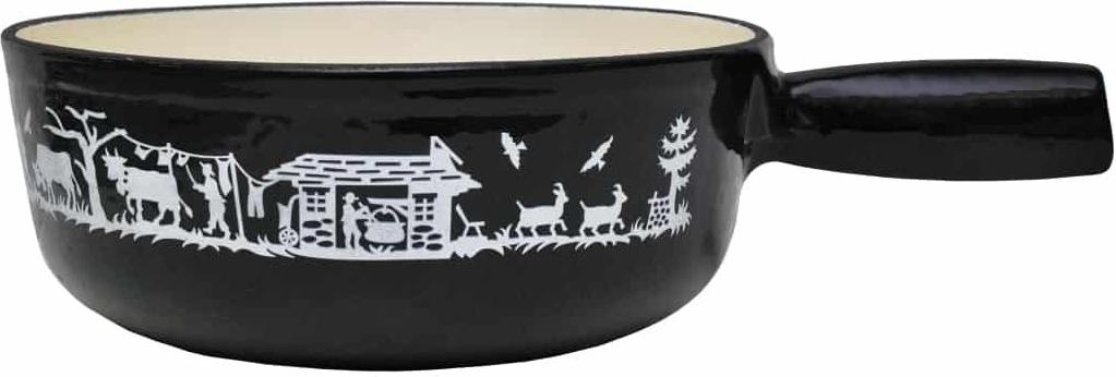 Der emaillierte Käsefonduetopf von ALPES aus Gusseisen besticht durch seine schwarze Außenseite, die cremefarbene Innenseite und das einzigartige weiße Design.