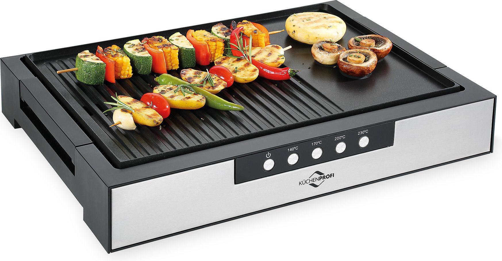 Mit dem Küchenprofi Tischgrill holen Sie den Grillspaß in die eigenen vier Wände und sitzen ganz gemütlich mit Ihren Gästen am Tisch. Auch für den Balkon oder Garten ist das kompakte Gerät ideal. Dank des leistungsstarken Heizelements ist der Tischgrill schnell am Start. Auf der extra großen Grillplatte verteilen Fleischfans und Veggies ihre Leckerbissen. Dank der voreingestellten Temperaturstufen gehören verbrannte Koteletts und trockenes Fischfilet der Vergangenheit an. Überschüssiges Fett landet in der Auffangschale.